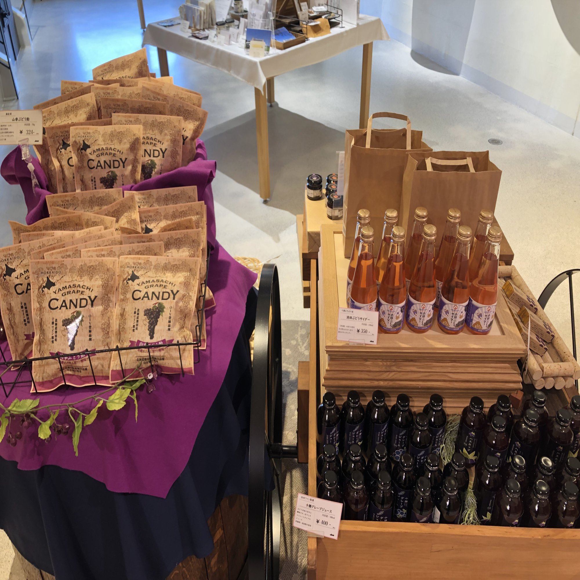 ちなみに下記写真内の右上に写っている「池田ブドウサイダー」はとかち帯広空港1Fの自動販売機でも販売されているので、探してみてください!(時期によっては販売していないこともあるかもしれませんが。)