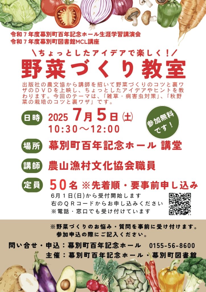 畑デビュー前の“庭いじり派”も、プランター派も大歓迎。2025年7月5日(土)、幕別町百年記念ホールで〈ちょっとしたアイデアで楽しく!野菜づくり教室〉が開かれます。講師は農業専門出版社・農文協のベテラン編集者。雑草・病害虫をサクッと抑えるコツから、失敗しがちな秋まき野菜の“裏ワザ”まで、実例写真とプロの知恵が満載です。参加無料・先着50名、6月1日受付開始。家庭菜園がもっとラクに、もっと面白くなる90分へようこそ!